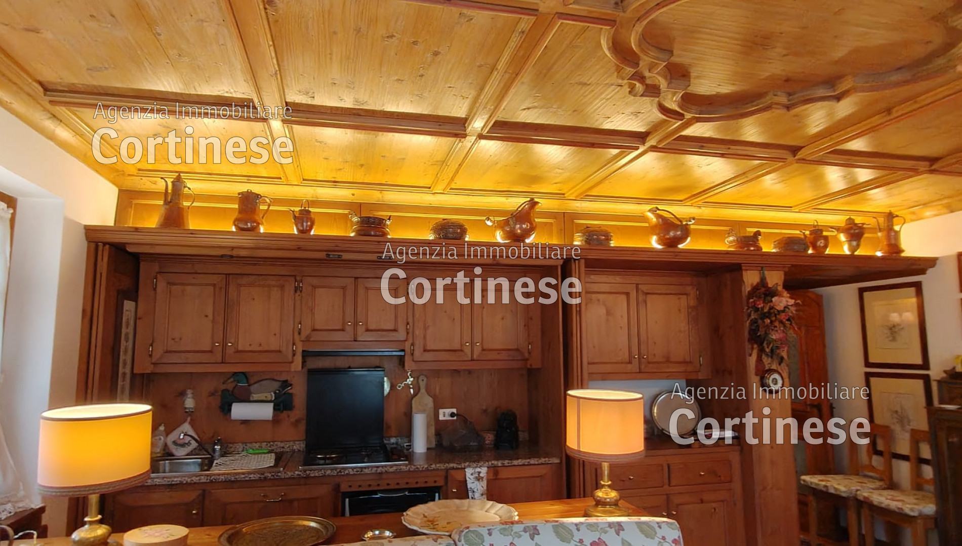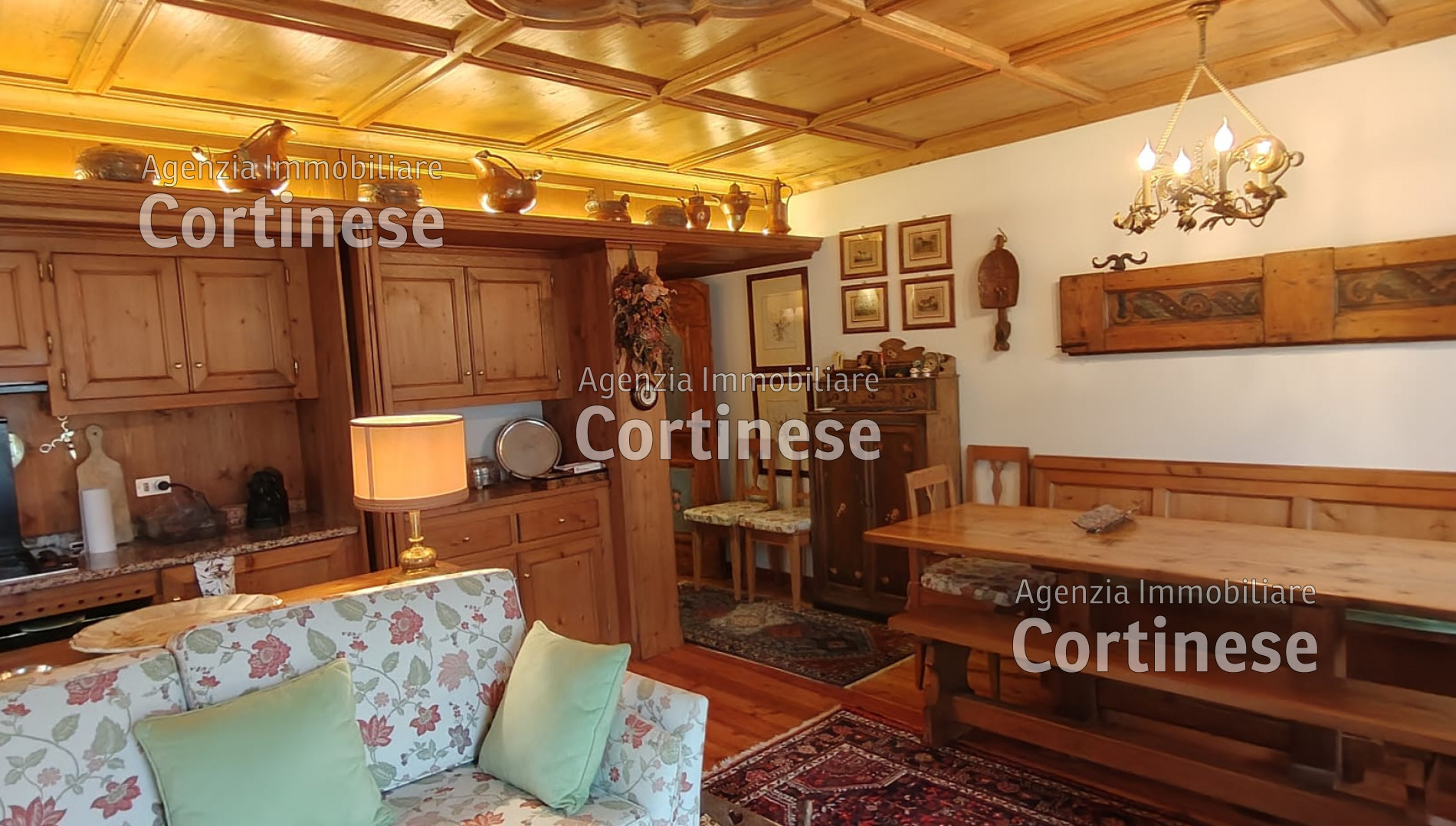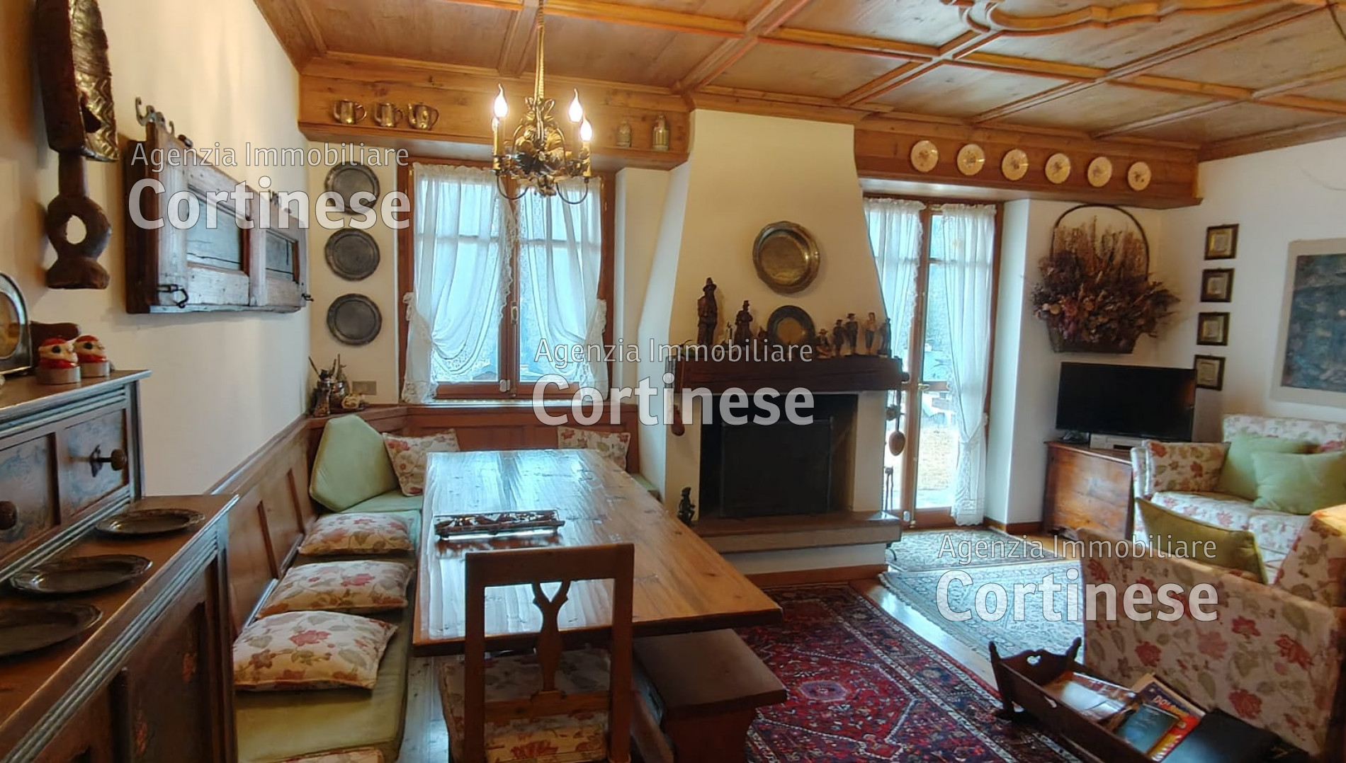 area divani, area pranzo con vetrata sul monte Pelmo e spaziosa cucina con