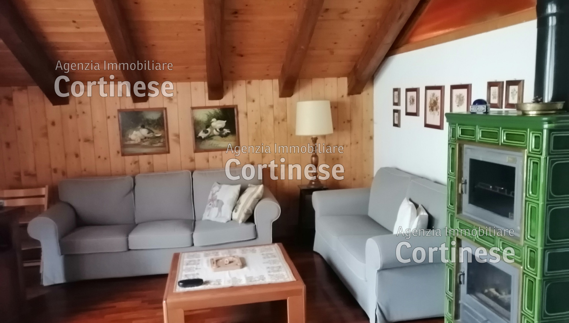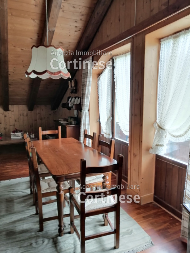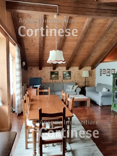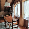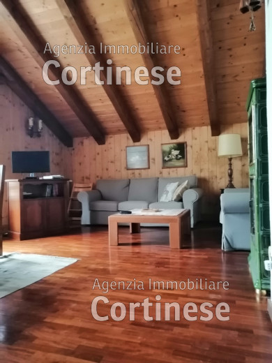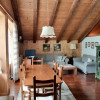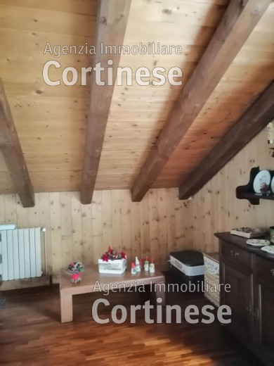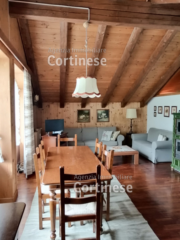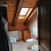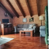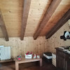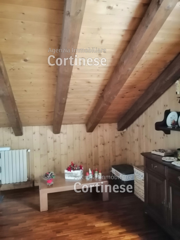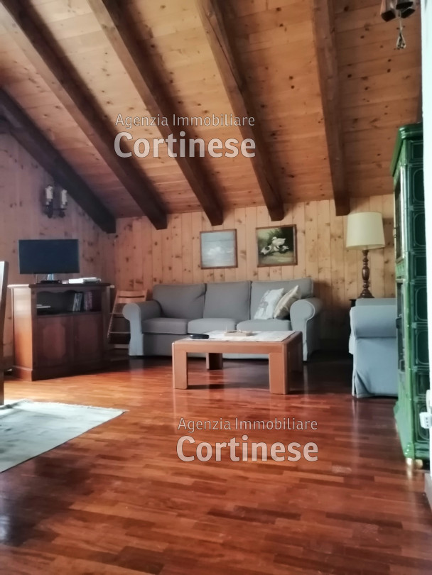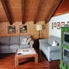 Sopra, al primo piano sottotetto un ottimo soggiorno con angolo pranzo, divani e TV. Una camera tripla, un bagno e la cucina speparata.