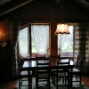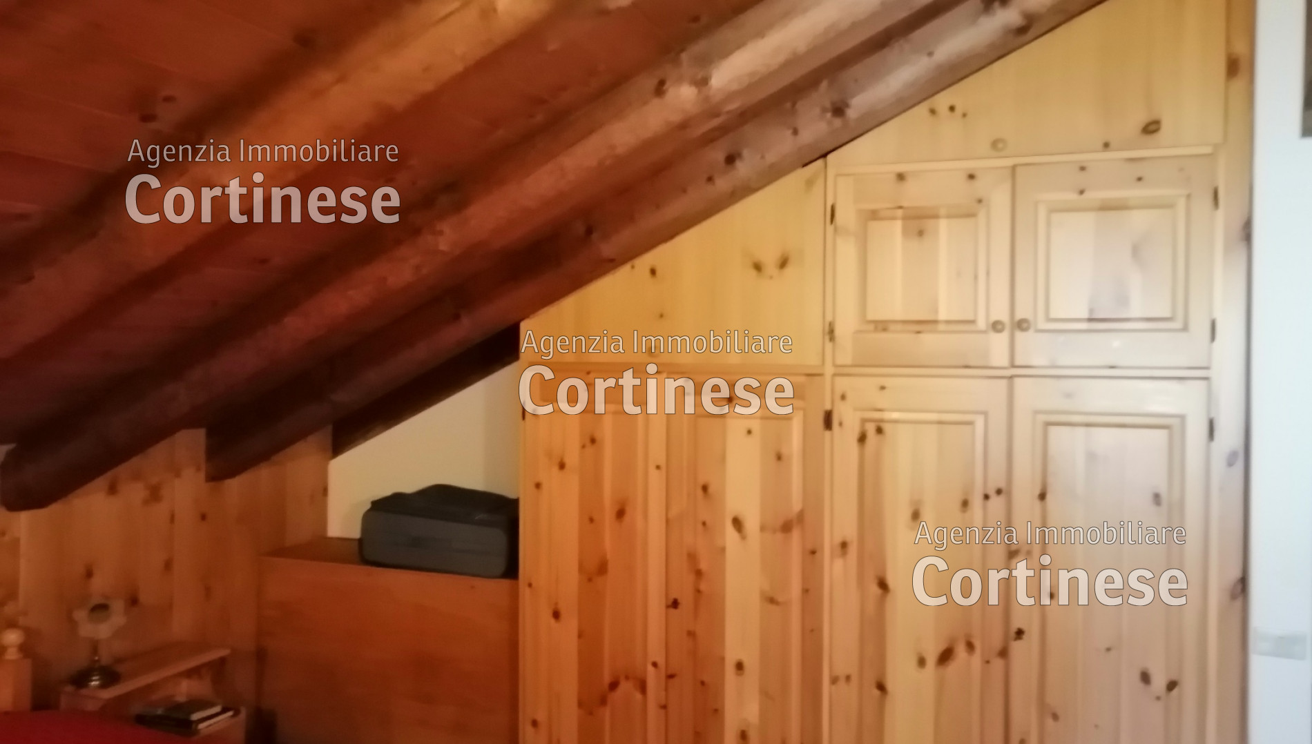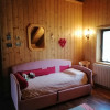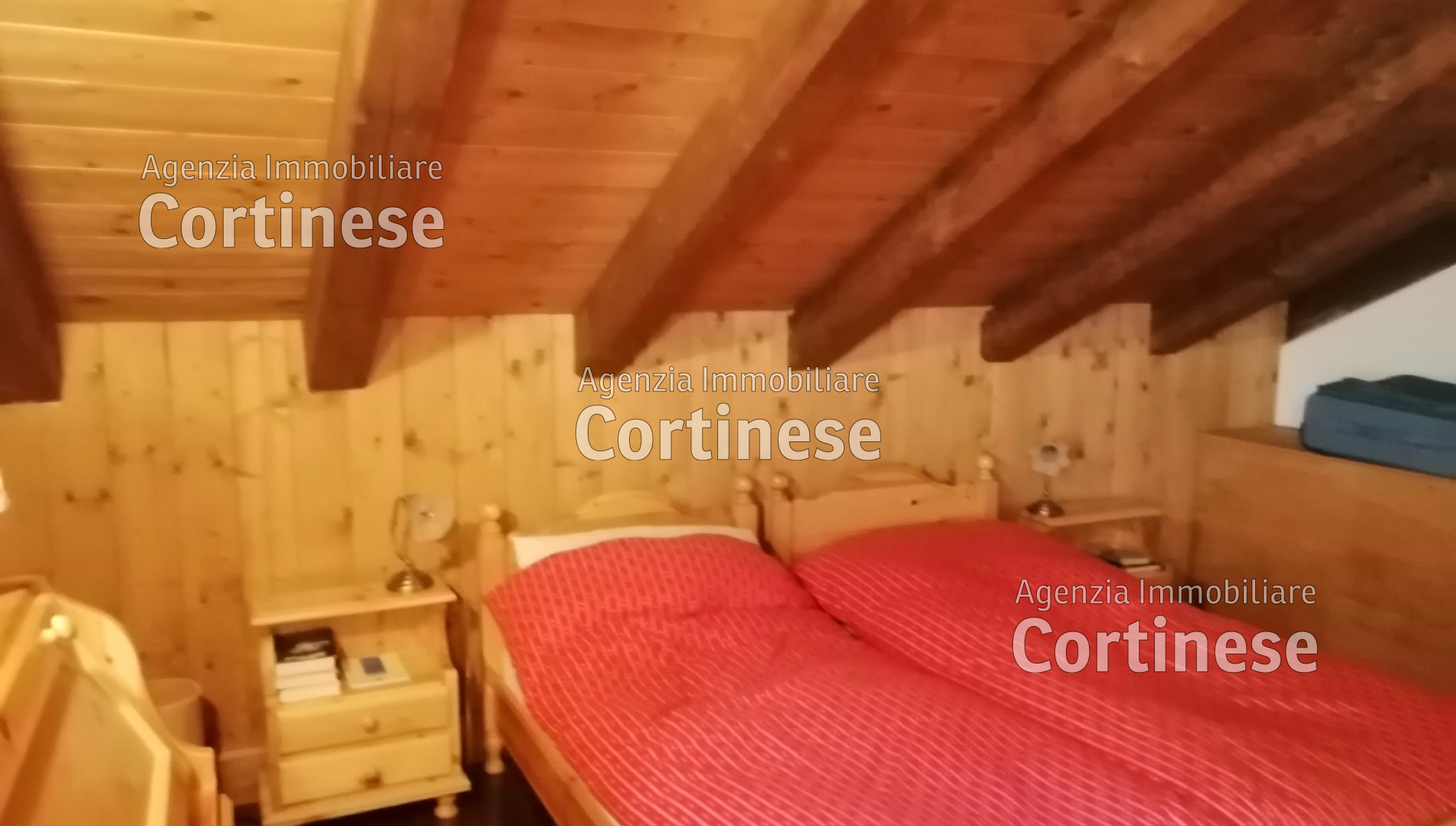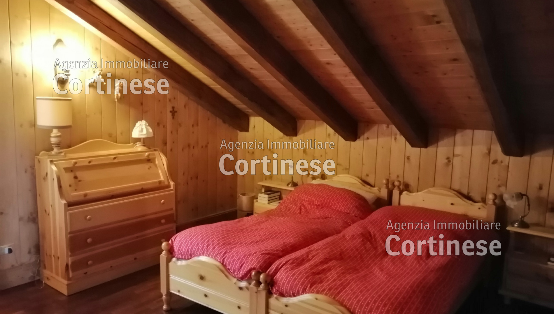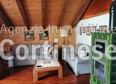 Sopra, al primo piano sottotetto un ottimo soggiorno con angolo pranzo, divani e TV. Una camera tripla, un bagno e la cucina speparata.